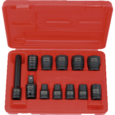 Hochleistungs-Schlagwerk, 3-fach Drehmomentvorwahl, vibrationsarm, Abluftführung durch den Handgriff nach unten, rutschfester kälteisolierter Soft-Grip-Hangriff, ultraleichtes Gehäuse, inklusive Steckschlüsselsatz 12-teilig (1/2 Zoll Antrieb, Sechskant-Innen SW 10, 11, 13, 14, 17, 19, 21, 22, 23 und 24 mm + Verlängerung (125 mm)