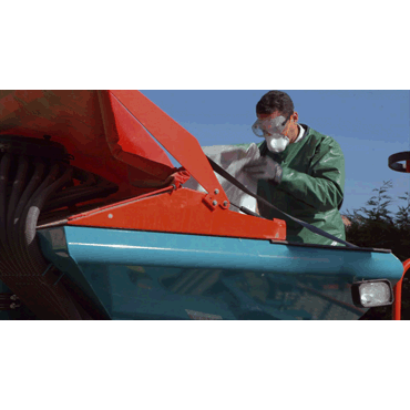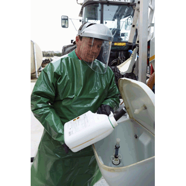 einfach und schnell An- und Abzulegen, dadurch keine Verschleppung von Chemikalienrückständen in die Traktorkabine, bedeckt großteils auch den Rücken, lange Ärmel, Klettverschluss am Hals, Einheitsgröße, die bis über die Stiefel reicht