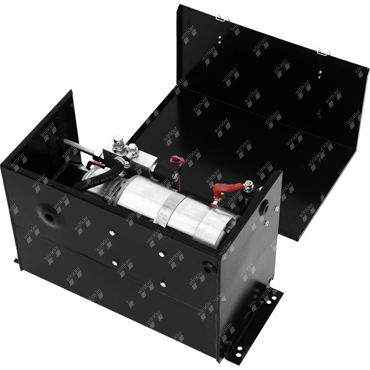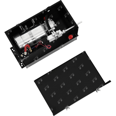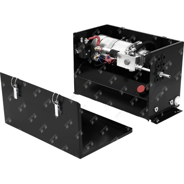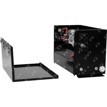 Motor-Pumpeneinheit komplett mit Behälter in Stahlbox verbaut. Direkte Montage am Fahrzeug oder Anhänger mittels L-Profilen. Eine komplette Einheit inklusive Druckbegrenzungsventil für alle Anwendungszwecke. Steuerungseinheit ist nicht im Lieferumfang enthalten.