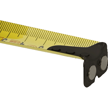 Gelb lackierter, abriebfester und polyamidbeschichteter Federbandstahl, mit mm-Teilung an Ober- und Unterkante, Skalenteilung in schwarz und Dezimalstellen rot markiert, automatischer Bandeinzug und Bandsperre, mit magnetischem Anschlag