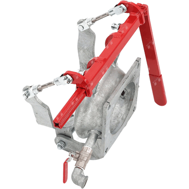 kurze, extra stabile Ausführung, mit angeschweißtem Kardanbecher und Flansch, höchste Kraftübertragung und sicherer Halt durch die sternförmige Profilierung des Handhebels, Handhebel ist wahlweise rechts oder links positionierbar und in 90 Grad Schritten 4-fach verstellbar, Entlüftung erfolgt durch einen 1/2 Zoll Kugelhahn mit griffsicherem Handhebel, der ebenfalls wahlweise links oder rechts montiert werden kann