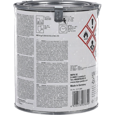 acid-curing, chromate-free 2C primer with active corrosion protection and excellent adhesion to iron, stainless steel and non-ferrous metals (soft/hard aluminum, zinc, chrome-plated stainless steel), can be overcoated with all Mipa 1C and 2C systems, coverage: 8-10 sqm/liter