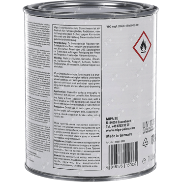 Mipa underbody protection spread is a highly robust coating for vehicle floors, wheel arches, etc. with long-lasting protection against corrosion, road salt and stone chips. very good adhesion, impact and scratch resistant, permanently elastic film, good anti-drumming effect, clean and drip-free application.