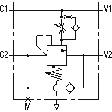 The load holding valve or lowering brake valve prevents loads on cylinders or motors from dropping uncontrollably. To do this, they are preloaded with a pressure setting that is higher than the largest possible load. A hydraulic piston opens the valve to achieve the desired lowering speed.