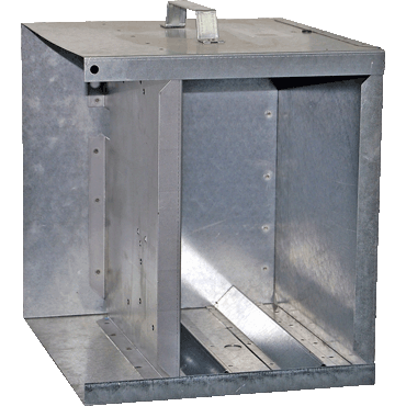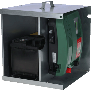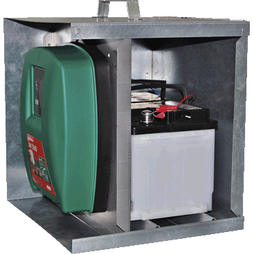 robust metal battery box out of galvanized steel, for wall mounting, also suitable for transport, offers space for batteries up to 110 Ah, inner dimensions WxDxH (cm) 36x21x32, delivery without device and without battery