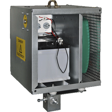 electrifiable metal battery box made of galvanized steel, including solid 100 cm long mounting / ground stake. external dimensions WxHxD (cm) 37.5x33.5x37.5, space for one rechargeable device max. WxHxD (cm) 36.5x11x37, space for one 12 V battery max. WxHxD (cm) 36.5x21.5x21, closable lock included in delivery, device or battery not included in delivery