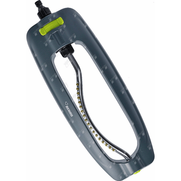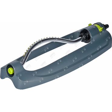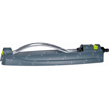 sprinkler for square watering of areas, whereby the spray width can be individually changed on the oscillating sprinkler can be connected to all commercially available plastic systems housing made of impact-resistant plastic, aluminum nozzle bend with 18 spray openings, rotatable connection union nut, 26.5 mm (3/4") internal thread with standard coupling plug, max. irrigation area: 150 sqm