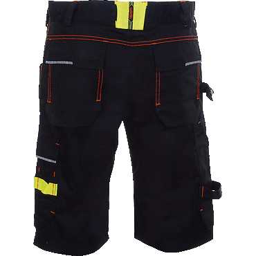 2 back pockets with hook and loop fastener, 2 slide-in pockets, right with integrated small additional pocket, hammer loop, side slide-in pocket for folding rule, pens etc., thigh pocket right with colored zipper and integrated ID card pocket, patch tool pocket left with one large compartment and hook and loop fastener, as well as three small compartments with loops in neon yellow, various discreet reflective piping
