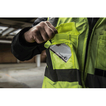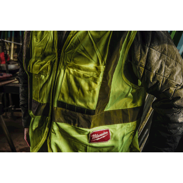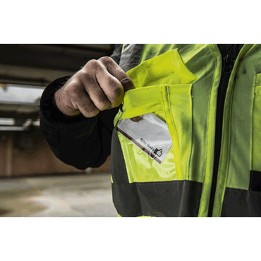 10 pockets for plenty of carrying volume, clear ID badge pocket for easy identification on the job site, adjustable size on the inside for well-fitting high-visibility vest, back opening for fall protection