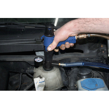 universally applicable, for filling the cooling system of common vehicles, by creating a vacuum within the cooling circuit, new coolant is automatically sucked into the system, during the vacuum process, the cooling system is simultaneously checked for leaks, bubble-free filling prevents air pockets in the cooling system, cleaning of the cooling system is unnecessary, universal fit due to conical rubber connection piece, in sturdy plastic case, filling device does not automatically drain old coolant, air pressure: min. 550 kPa or max. 690 kPa, air consumption: max. 180 l/min or 690 kPa, pressure gauge: up to max. -30 PSI / -1 bar, vacuum: 0.85 bar at 690 kPa