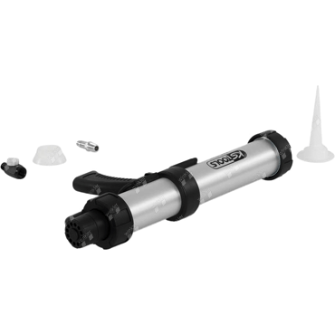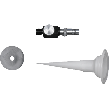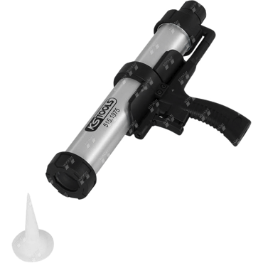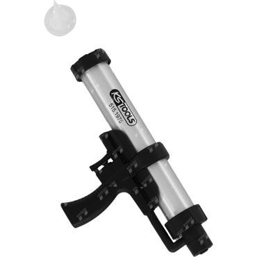 for processing cartridges and softpacks, ideal for silicone or acrylic-based adhesive cartridges, for gluing in windshields as well as most rear and side windows, can also be used for car body sealant, seam adhesive, etc., perfect guidance of the cartridge piston due to telescopic principle, therefore no piston tipping or air pockets, drip-free mechanism, infinitely variable feed, with two adapters for cartridge and bag, with safety pressure relief valve, including compressed air regulation for the outlet speed, handy and ergonomic 2-component housing, aluminum housing, handle made of plastic