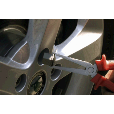 for the assembly and disassembly of hubcaps, specially shaped pliers tip for optimal removal of the wheel bolt protective caps, with 2-component handle, matt chrome plated, chrome vanadium