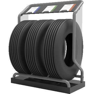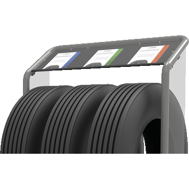 Show off your truck tires with the new modern designed display that features beautiful contours, customizable acrylic panels and a high quality powder coat finish. Its solid steel construction displays 3 TBR tires of up to 44 inches/1118 mm outside diameter and the adjustable dividers fit the width of your tires. The display for truck tires is equipped with a steel head piece covered with an acrylic disk and holds 3 data sheets of the tires displayed.