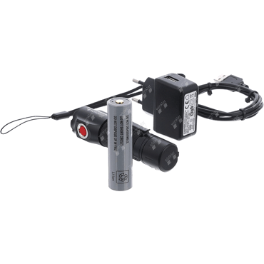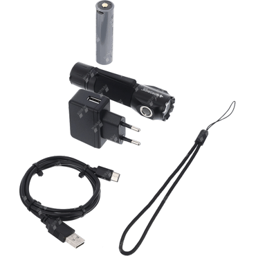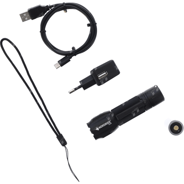 rechargeable tactical flashlight, powerful 1100 lumens, direct operation of 1100lm strobe mode (red button) for self-defense in emergency situations, flashlight (grey button) with 4 functions (high beam 1100lm, medium 550lm, low 120 lm, SOS), powerful Cree LED, fluorescent light ring, dust and water resistant (IP68), robust belt clip, quality aluminum, integrated magnet for attachment, ICR18650 battery with USB-C socket, battery level indicator and charge indicator, includes battery, USB-C cable, 230V charger and wrist strap