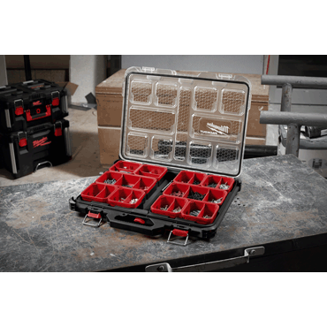 part of the PACKOUT™ modular storage system. construction made of shock-resistant polymers - ideal for construction site use. contains 2 large and 8 small sorting boxes. All sorting boxes contain dividers. transparent lid secures all sorting boxes when closed. IP65 protection class protects against dust, water and dirt