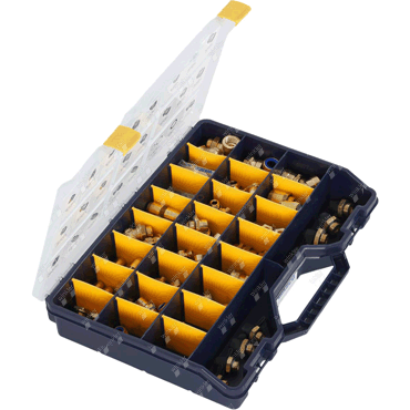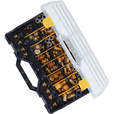 The assortment box includes the most common screw connections of the Raufoss BRK system.