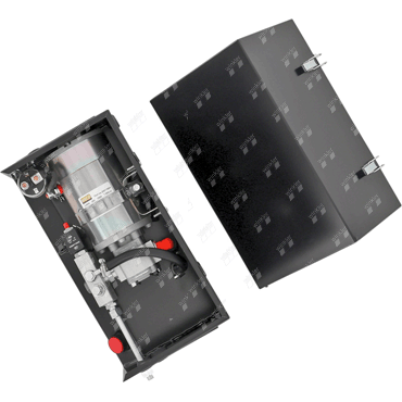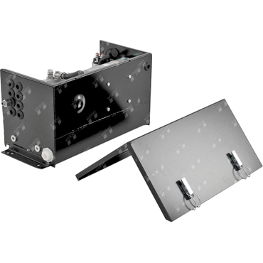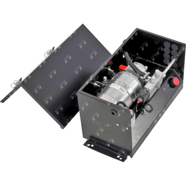 Motor-pump unit complete with tank installed in steel box. Direct mounting on the vehicle or trailer by means of L-profiles. A complete unit including pressure relief valve for all applications. Control unit is not included.