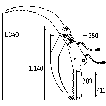 for easy and quick conversion of the carrier frame to hydraulic gripper arm. uncomplicated assembly thanks to the low weight of just 75 kg and attachment and mounting on pallet forks via the FEM2A mount. To fix loads such as thick branches, thin logs or round timber on the pallet fork. powerful hydraulic cylinder on top in protected position with high closing force. opening width 1.3400 mm (with center of gravity 500 mm). greasable pivot points and high-quality powder coating. delivery includes hydraulic hoses and quick coupling plug BG3, a double-acting control unit is required on the vehicle side.