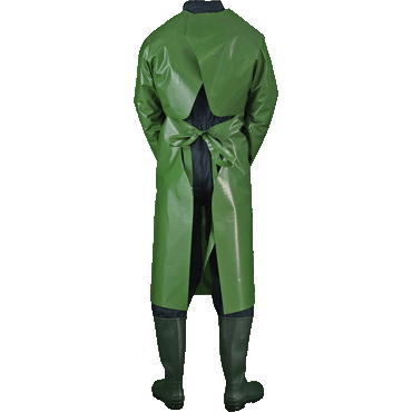easy and quick to put on and take off; therefore, no carry-over of chemical residues inside the tractor, covers almost all of the back, long sleeves, hook and loop fastener at the neck, one size fits all, slides over boots