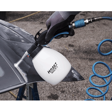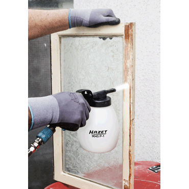 mineral blasting gun for damage-free cleaning and paint stripping, does not damage rubber, glass or plastic parts, protects bare metal immediately from corrosion (in contrast to sandblasting), no heating / deformation of sheet metal during blasting, optimally suited for professional or hobby use, for gentle removal of graffiti as well as for facade and monument cleaning, removes paint from wooden objects without damage, removes paint from glass surfaces and window frames without damaging glass and seals, frees boats from coatings without attacking hulls, with preset precision nozzle for optimum performance, for blasting with NaHCO3 (sodium bicarbonate), handle, trigger and valve made of acetal plastic, seals and O-rings made of nitrile, spring made of hardened spring steel, container made of PEHD, coupling plug: integrated, nominal size 7.2, air consumption [l/min]: 280 l/min(4. 7 l/sec), incl. high performance wide jet nozzle, refillable container with 1.2 l volume, 1 kg soda mineral blasting agent