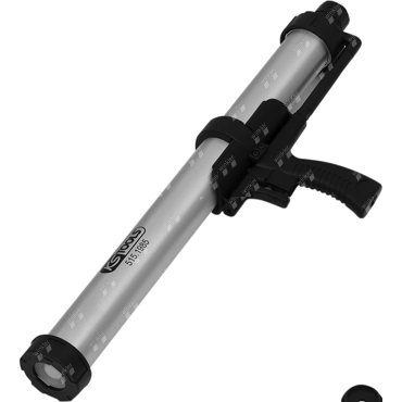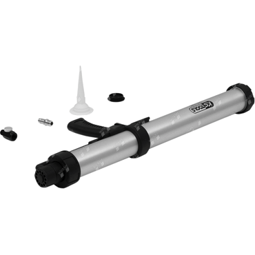 for processing cartridges and softpacks, ideal for silicone or acrylic-based adhesive cartridges, for gluing in windshields as well as most rear and side windows, can also be used for car body sealant, seam adhesive, etc., perfect guidance of the cartridge piston due to telescopic principle, therefore no piston tipping or air pockets, drip-free mechanism, infinitely variable feed, with two adapters for cartridge and bag, with safety pressure relief valve, including compressed air regulation for the outlet speed, handy and ergonomic 2-component housing, aluminum housing, handle made of plastic