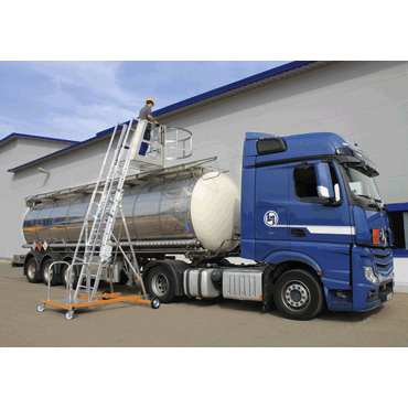 two-part ladder with platform and safety cage, height adjustable, stainless steel guide and connecting parts, yellow powder-coated chassis with four castors, flanged non-slip rungs, platform height of the tanker ladder can be adjusted in height in increments of 280 mm by means of a cable winch, Locking from rung to rung, platform with R13 grating, railing on both sides with foot and knee rail, platform front with two-part safety door and safety cage (this can be selected and must be ordered separately), tanker ladder is used exclusively as access for operating and inspection work during loading and unloading