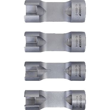 The specially shaped socket wrench inserts in widths of 14, 17, 19 and 21 mm enable quick and professional loosening and tightening of union screw connections on high-pressure fuel lines and exhaust gas temperature sensors. The special design of the socket wrench inserts (drive and output are on the same axis) enables controlled tightening of the union screw connection with tightening torque. conventional offset socket wrench inserts, where the drive and output are not on the same axis, distort the tightening torque.