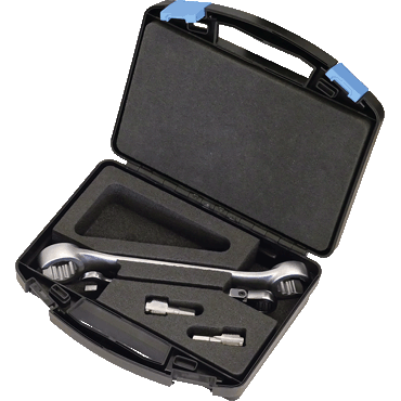 for exhaust gas sensor, universally suitable for NOx sensors, lambda sensors and injection units for soot/particle filter regeneration with M20x1.5 and M22x1.5 mounting thread. for quick recutting of coked or damaged mounting threads on the exhaust pipe. also for very confined spaces. no need to remove the entire exhaust pipe. includes open ring wrench for loosening and tightening the exhaust sensors and units.