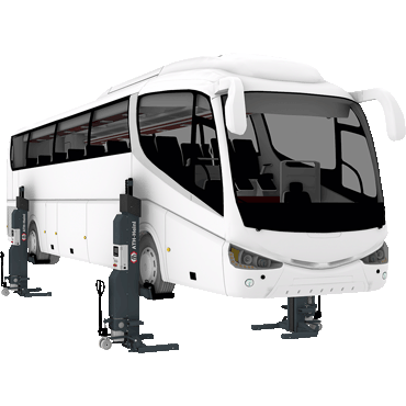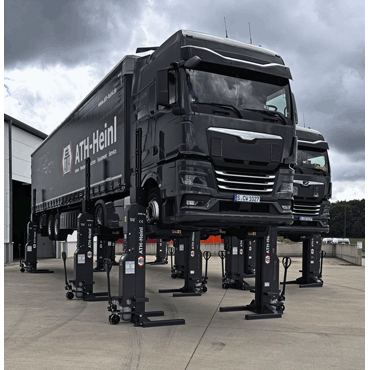 electro-hydraulic wheel gripper system with battery operation and wireless control. control unit including unit cover on each column for flexible use. master control provides all operating information on each column and can be expanded to up to 16 columns. integrated quick charger for each column, enables charging during use. mobile kit and forklift attachment on the columns enable faster position changes. safety control: hydraulic shut-off valve, electronic synchronization monitoring and electromagnetic safety catches. safety Lock: control for placing the load in the safety notches. multifunctional mount via variable wheel fork with individual adjustment options..