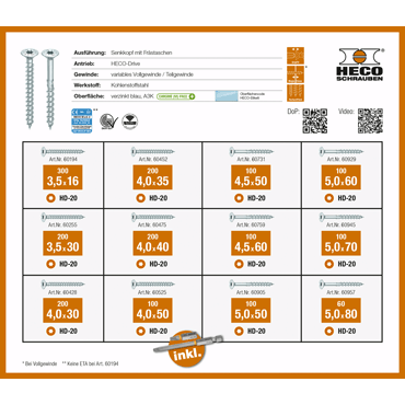 HECO-TOPIX-plus tête fraisée avec poches de fraisage, filetage complet, HD-20, zingué bleu, A3K : 300 pièces 3,5x16 mm, 200 pièces de chaque 3,5x30, 4,0x30, 4,0x35, 4,0x40 mm, 100 pièces de chaque 4,0x50 ainsi que HECO-TOPIX-plus tête fraisée avec poches de fraisage, filetage partiel, HD-20, zingué bleu, A3K : 100 pièces 4,5x50 mm, 50 pièces de chaque 4,5x50, 4,5x60, 5,0x50, 5,0x60, 5,0x70 mm,, 60 pièces 5,0x80 mm, avec 1 pièce embout HECO-Drive, 25mm, HD-20 et 1 pièce embout HECO-Drive, 70mm, HD-20