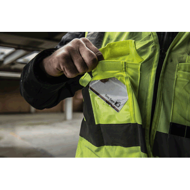 10 kieszeni zapewniających dużą pojemność, przezroczysta kieszeń na dowód osobisty ułatwiająca identyfikację na budowie, regulacja rozmiaru od wewnątrz, dobrze dopasowana kamizelka ostrzegawcza, tylne rozcięcie chroniące przed upadkiem